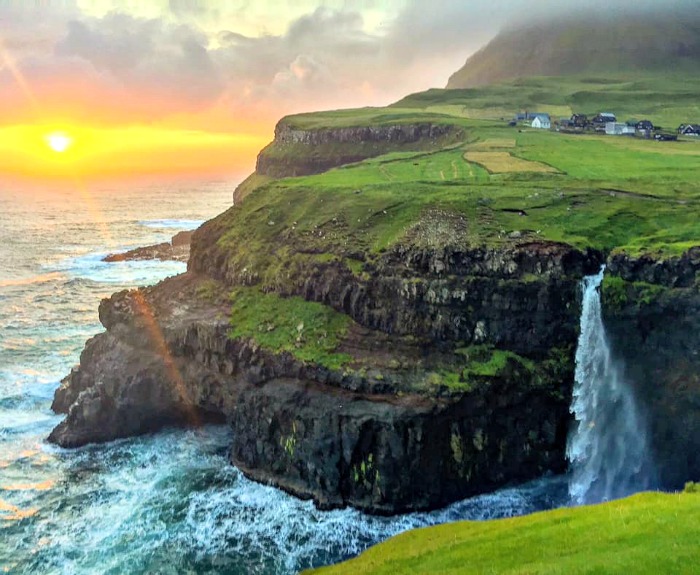 1. Cascata Molafossur a Gasadalur. Il trekking da Bour a Gasadalur è sconsigliato ai bambini sotto gli 8 anni ma si arriva a vedere la cascata dal parcheggio, situato poco prima di Gasadalur. Il percorso dal parcheggio alla cascata è di soli 300 metri. Prestate attenzione solo a non scivolare. Il panorama che vi aspetta è presente in tutte le cartoline delle Isole Faroe.
