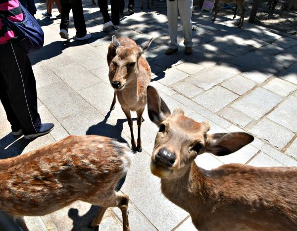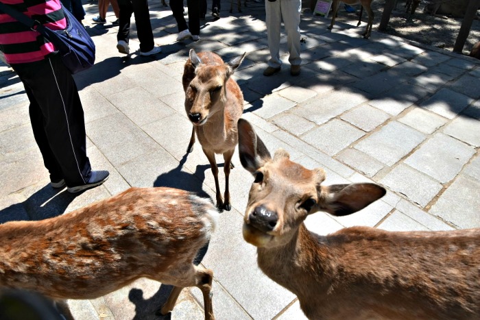 Abbiamo ripreso la JR Nara line e poco prima di mezzogiorno eravamo a Nara. Fuori dalla stazione, dalla banchina nr.2, abbiamo preso un bus (mi pare che la corsa costi 210yen) e in un attimo eravamo davanti al Todai-ji. È che spettacolo!! Non ce lo aspettavamo davvero! Ci siamo poi attardati nel parco circostante per dare i cracker ai famosissimi cervi di Nara. Uno spasso coi bambini!