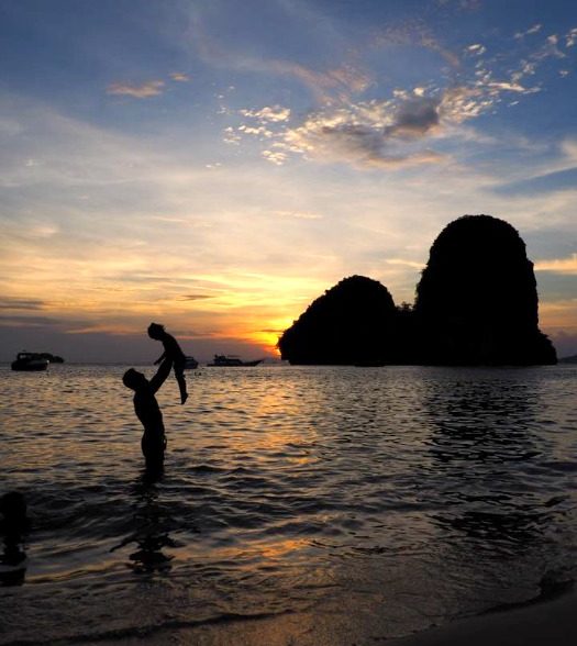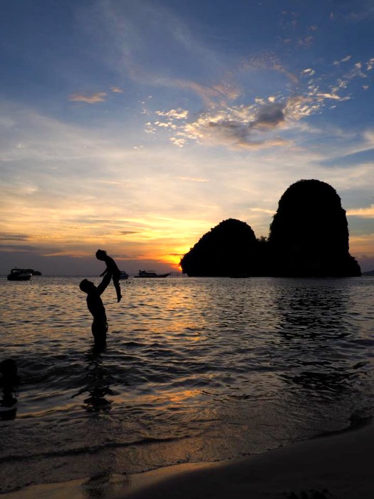- 3 notti al Sand Sea Resort a Railay Beach: bel ristorante sulla spiaggia, camera tripla molto grande, ma soprattutto ottima posizione!! La sera ci regalava dei tramonti stupendi. Dal resort in 15 minuti a piedi si arriva direttamente alla spiaggia di Phra Nang Cave, bellissima, ci siamo andati due volte, una a piedi e una volta in canoa. Il tramonto lì è unico. Ci sono poi un sacco di Longtail attraccate che offrono da mangiare, da bere e gelati a gogo. Quello arcobaleno era il preferito delle piccole!