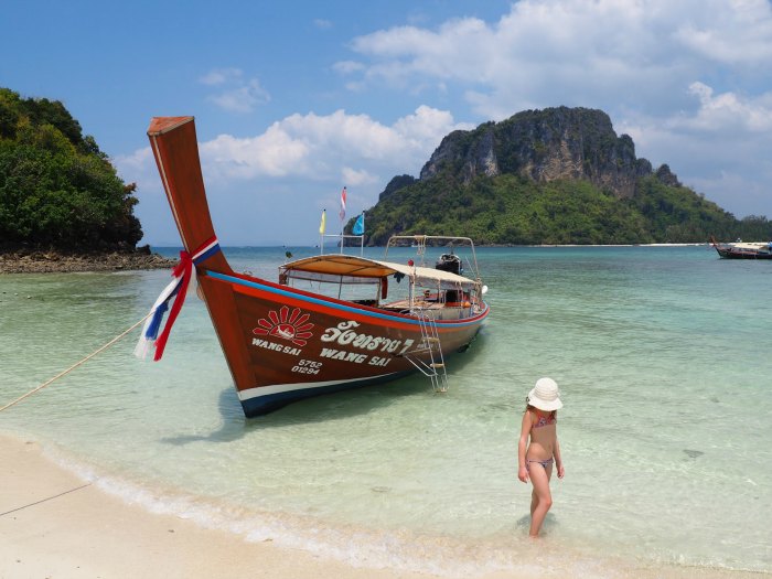 Escursione Hong Island e Lading Island (da AoNang) longtail privata, intera giornata 2500 + 500 al barcaiolo per andare anche a Lading. Bellissime entrambe, siamo stati quasi tutto il giorno a Hong island e le bambine si sono divertite un sacco a mollo nell’acqua molto bassa e c’erano tanti pesciolini, abbiamo visto a riva anche un piccolo squaletto! All’interno c’è un piccolo ristorantino dove si possono mangiare i classici piatti thailandesi (riso o pollo) e vedere anche i piccoli varani che popolano l’isola.