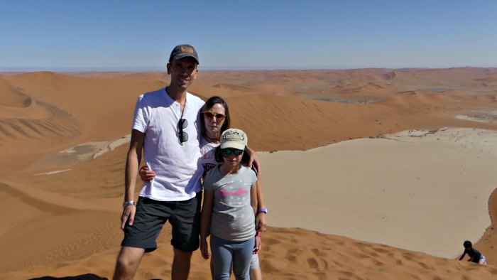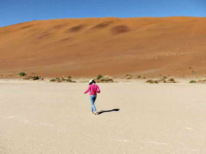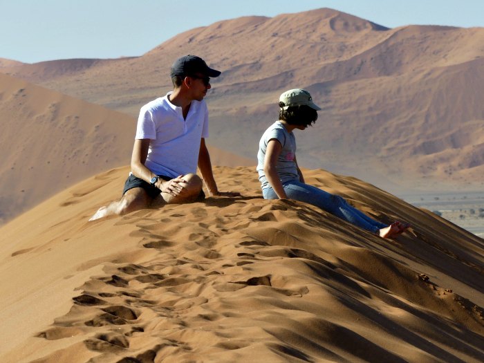 La duna 45 non ci sentiamo di farla, nostra figlia era stanca; ci fermiamo ugualmente perché una delle due famiglie che viaggia con noi decide di salire, noi dovevamo fare solo foto, invece nostra figlia Viola comincia la salita assieme all’altra bambina e così noi con lei. Arriviamo in cima, anche qui panorama mozzafiato e discesa altrettanto bella. Rientro al lodge e cena.