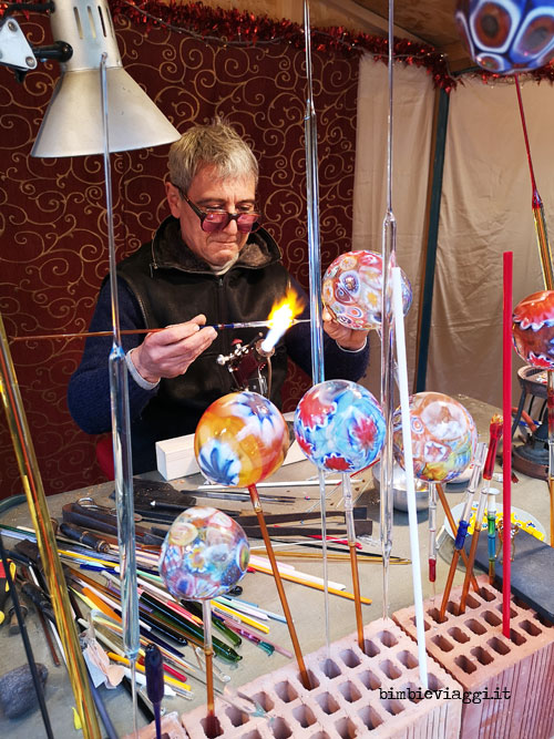 Vicino all’ingresso ci sono le i mercatini natalizi, dentro a colorate casette in legno, dove è possibile acquistare prodotti artigianali. Tra le altre cose, abbiamo potuto vedere dal vivo come vengono realizzate le palle di vetro soffiato (grazie ad Aldo Giannone di Alassio, originario di Murano).