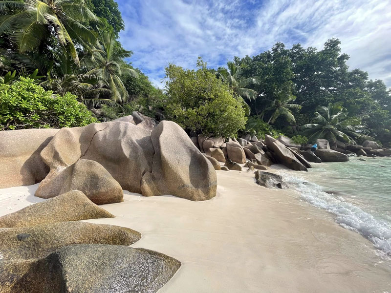A pranzo ci spostiamo ad Anse Kerlan. Avendo prenotato ci vengono a prendere con una navetta, farla sotto il sole con tutti i sali e scendi sarebbe stata tosta. Anse Kerlan per me è ancora più bella di Anse Georgette; qui il mare non era tanto mosso e abbiamo potuto fare tranquillamente il bagno e utilizzare i lettini dell’hotel. Spettacolare!