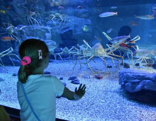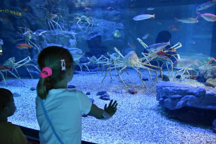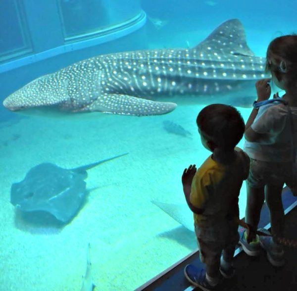 Abbiamo acquistato i biglietti d’ingresso all’acquario da Family Mart il giorno prima perché sapevamo che le code in biglietteria potevano essere lunghe, però all’atto pratico, nonostante fosse domenica, la situazione ci è parsa gestibile. L’acquario ci è piaciuto moltissimo! Si sviluppa in larga parte attorno alla grande vasca degli squali balena con un lungo percorso a chiocciola in discesa.