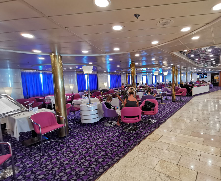Durante il nostro viaggio, i passeggeri si sono posizionati negli spazi comuni, all’aperto e al chiuso, senza assembramenti. Il bel tempo ha reso fruibili anche i tavoli a fianco della piscina, oltre ad altri spazi all’aperto lungo le parti laterali della nave (ovviamente la possibilità di stare all’aperto dipende molto anche dal sole, dal vento e dalla voglia di starsene qualche oretta fuori invece che all’interno).