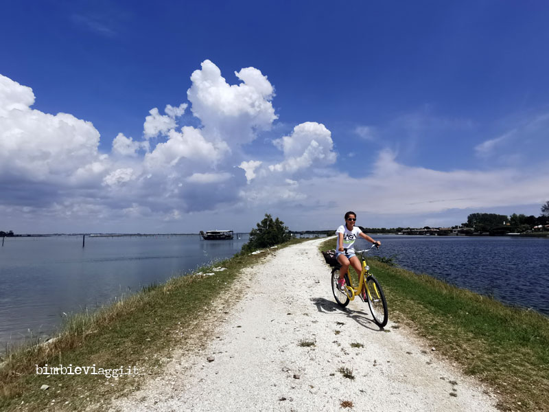 Tra le attività organizzabili, consiglio vivamente di percorrere in bicicletta l’intero perimetro dell’isola, per arrivare al suggestivo incontro tra la laguna e il mare…in una piccola pista sterrata (ma semplice da percorrere anche con i bambini) sembra di pedalare sull’acqua, affiancati dalla laguna con le sue reti da pesca, su un lato, e, dall’altro, dalle casette colorate dell’isola…