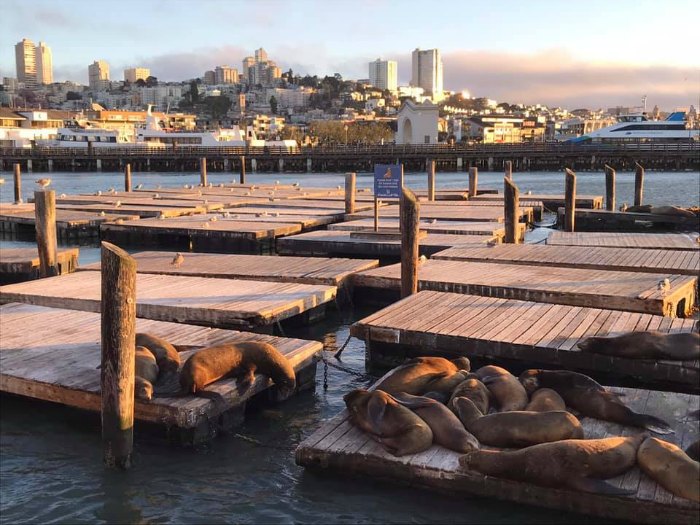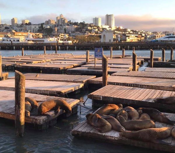 Proseguiamo con il bus (i biglietti si fanno sui mezzi e la “corsa” ha validità 2 ore) verso Alamo Square Park, per ammirare le “painted ledies” le villette colorate in stile vittoriano, che fanno super contrasto con i grattacieli che si trovano sullo sfondo. Oltre ai turisti in questa zona e nel parco, abbiamo notato vita vera di locali che si godono la zona. Da qui ci spostiamo finalmente al Pier 39, dove ci sono i leoni marini al tramonto ad aspettarci. Che dire… bellissimi e tenerissimi, vedere gli animali che vivono nello stato naturale mi fa sempre emozionare. Ceniamo in un localino per mangiare un po’ di buon pesce, zuppa di granchio e cozze al Pier, senza ombra di dubbio i locali e negozietti qui sono super turistici, piuttosto cari, ma a mio parere è un peccato saltarli. Sono comunque ben tenuti belli ed ordinati, almeno una passeggiata qui bisogna farla! Rientriamo verso l’hotel (ebbene si, abbiamo raggiunto un record di 18 km fatti dalla mattina alla sera a piedi!) perdendoci, ma salendo e scendendo sulle tipiche colline e dovendo infine attraversare pure Lombard Street anche se non era in programma.