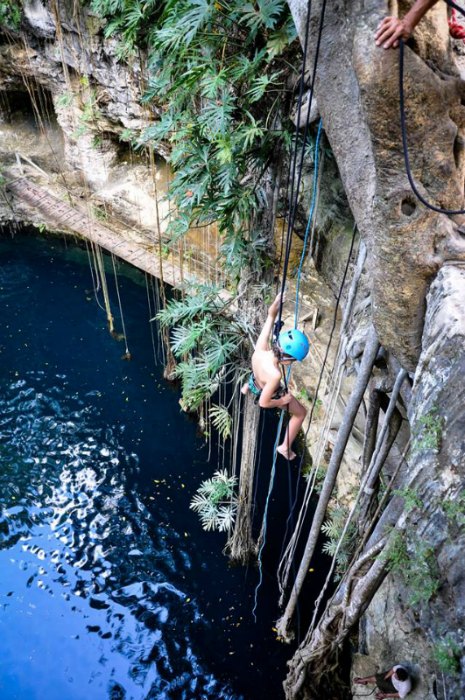 Molto bello anche il cenote vicino a Ek Balam, grande, profondo e a cielo aperto. Abbiamo pagato 300 pesos a testa comprensivi di noleggio bicicletta per raggiungerlo, giro sulla zipline e discesa in doppia corda… divertentissimo per i ragazzini (e anche per me!). Offre dunque un assaggio di attività-avventura ma nel rispetto della natura, ed è gestito da una cooperativa locale.